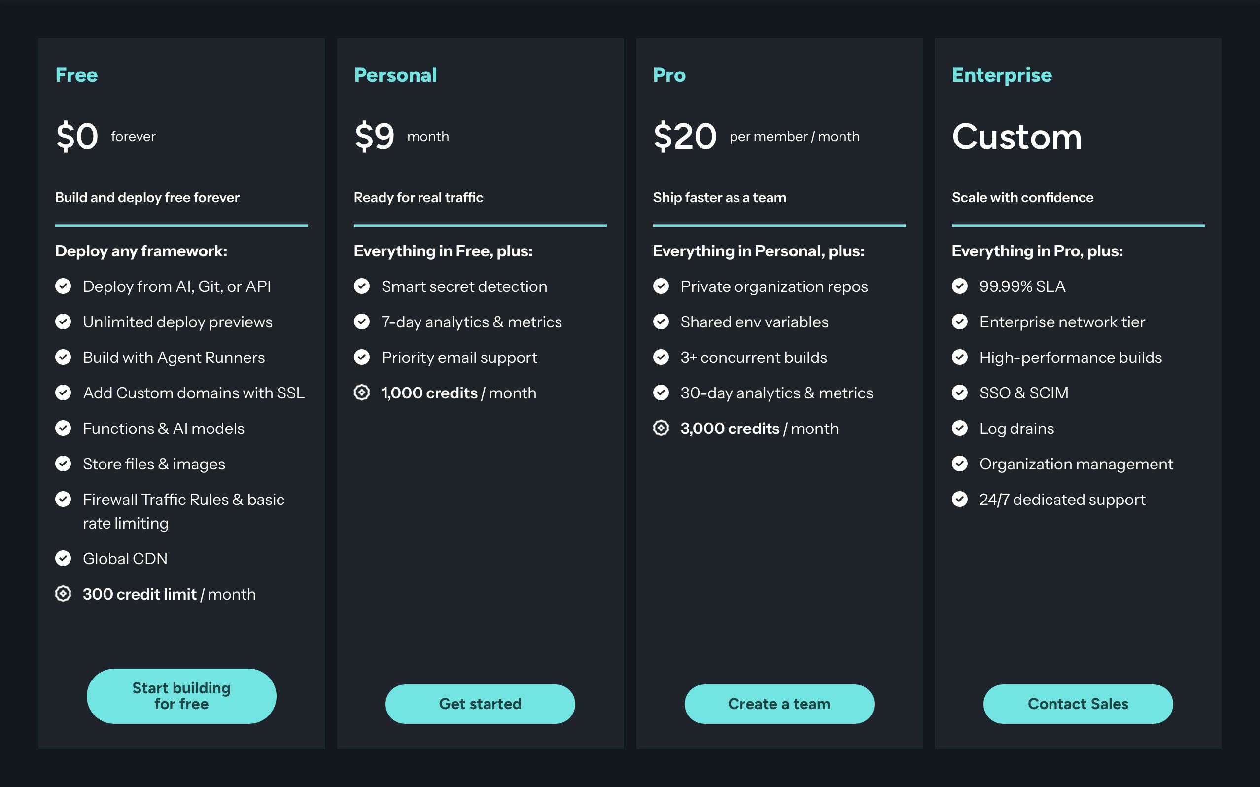 ですが、Netlify では 2025 年 9 月に料金プランの改定があり、クレジットという概念が導入されました(以下こちらを新プラン、以前のレガシープランを旧プランと呼びます)。
